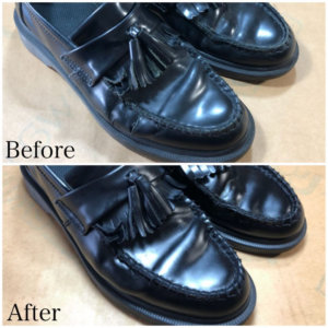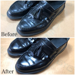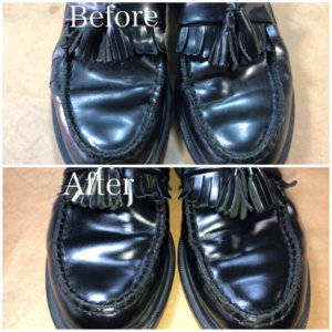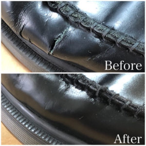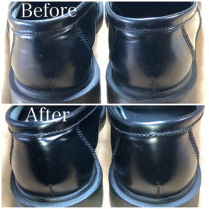 美容師の息子の靴、1日十数時間の立ち仕事やはり傷みは早い。内側から補正し同色染め直し上手くいきました。