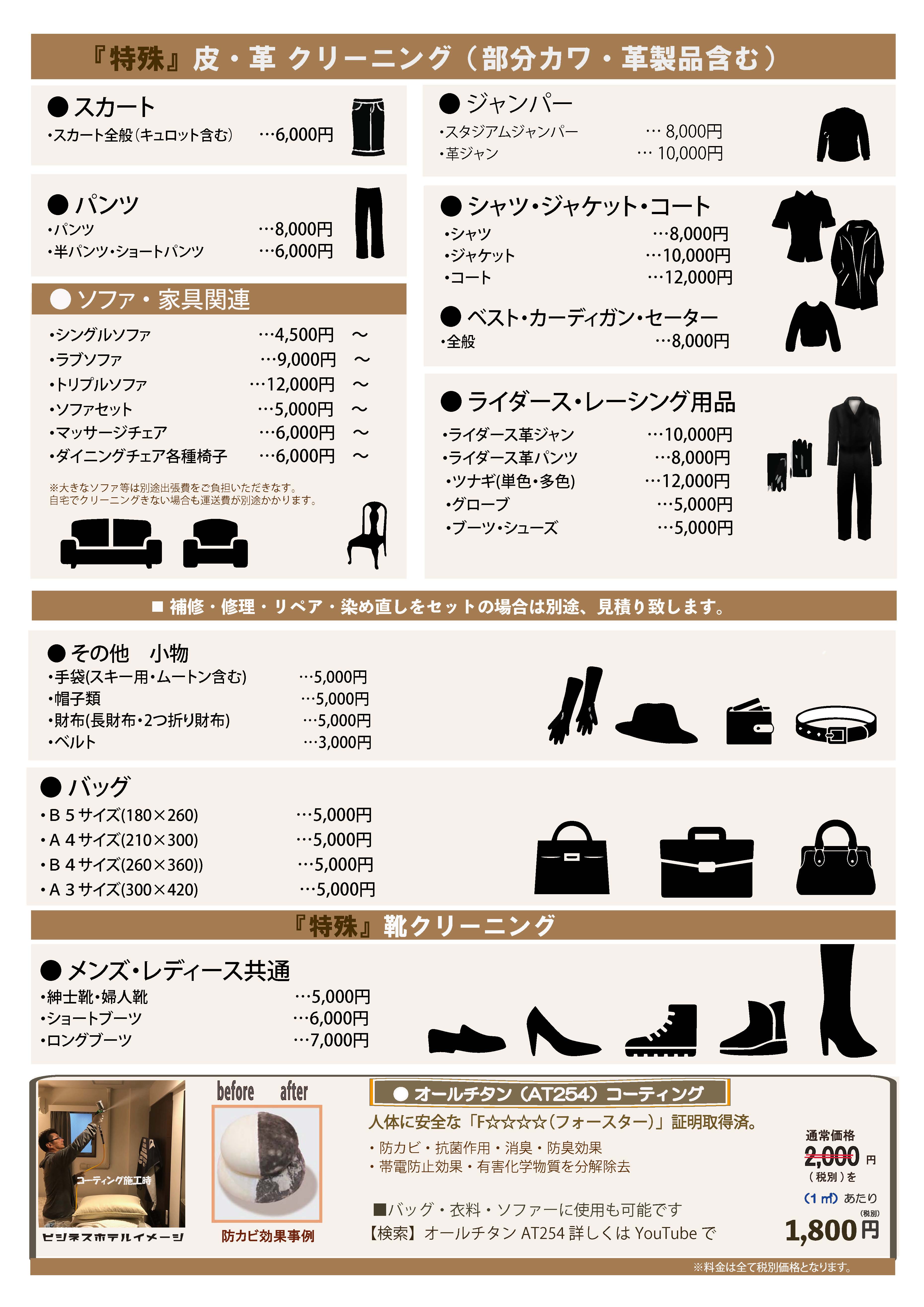 革・レザー 特殊クリーニング価格 バッグ・小物関係 Sサイズ(タテ+ヨコ 35cm未満)5,000円➡ 3,000円~ Mサイズ(タテ+ヨコ 60cm未満)6,000円➡ 4,800円~ Lサイズ(タテ+ヨコ 90cm未満 […]